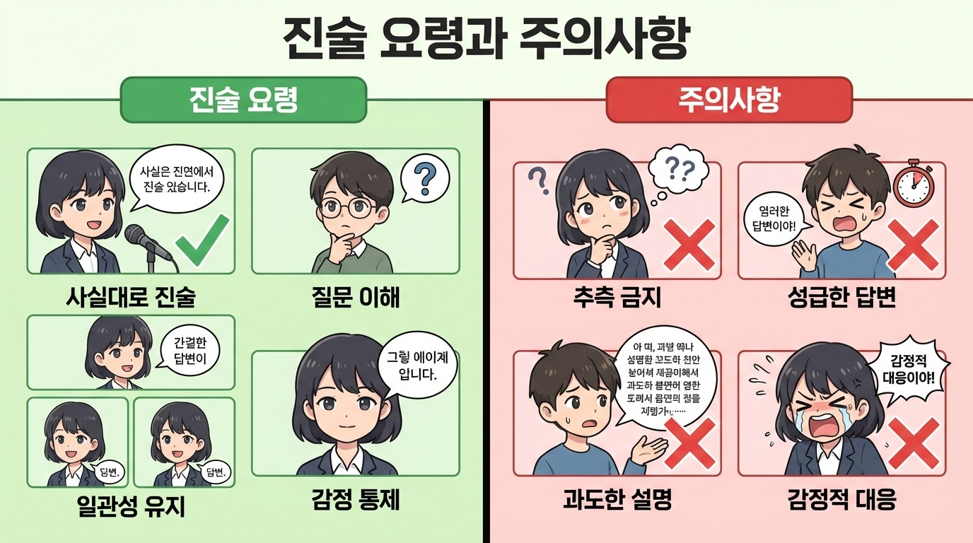 가장 중요한 원칙은 사실대로 진술하되 아는 것만 답변하는 것입니다. 거짓 진술은 나중에 모순이 드러나면 신뢰성을 잃게 됩니다. 하지만 모든 것을 다 말해야 하는 것은 아닙니다. 질문받은 내용에 대해서만 답변하고, 자발적으로 불필요한 정보를 제공할 필요는 없습니다.