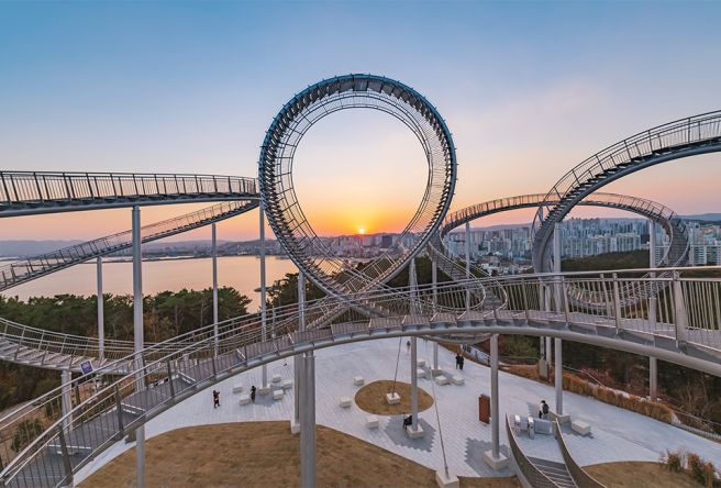 포항 환호공원에 위치한 스페이스워크는 마치 롤러코스터가 멈춰 있는 듯한 독특한 곡선형 디자인으로 전 세계적인 관심을 받고 있습니다. 독일의 예술가 부부가 디자인한 이 체험형 조형물은 직접 계단을 걸어 올라가며 포항의 전경을 360도로 조망할 수 있습니다. 높은 곳에서 맞이하는 일출은 지상에서 보는 것과는 차원이 다른 개방감을 선사합니다. 영일대 해수욕장과 포스코의 야경이 어우러진 새벽 풍경은 미래 도시에 온 듯한 착각을 불러일으킵니다.