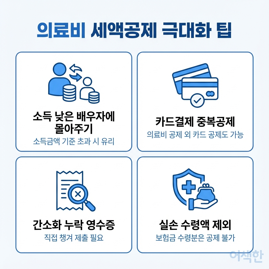 의료비 세액공제를 최대한 활용하기 위한 전략도 있습니다. 첫째, 의료비는 몰아주기가 가능하므로 부부 중 총급여가 적은 사람에게 몰아주면 총급여 3퍼센트 기준선이 낮아져 더 많은 금액을 공제받을 수 있습니다. 둘째, 의료비를 신용카드로 결제하면 의료비 세액공제와 신용카드 소득공제를 중복으로 받을 수 있습니다. 세이브택스의 자료에 따르면 의료비를 신용카드로 계산했다면 중복 적용이 가능하며, 현금영수증과 직불카드도 포함됩니다. 셋째, 연말정산 간소화서비스에 조회되지 않는 의료비는 병원에서 직접 영수증을 발급받아 제출해야 합니다. 보험저널 보도에 따르면 부양가족 1인당 연 50만원 한도가 적용되는 항목도 있으므로 간소화 서비스만 믿지 말고 직접 확인하는 것이 중요합니다.