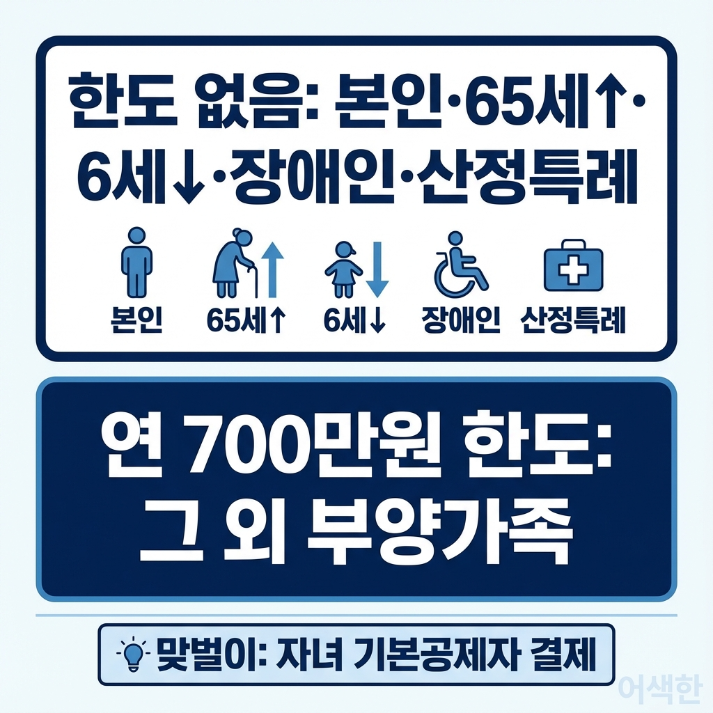 의료비 세액공제 대상자는 크게 두 가지로 나뉩니다. 첫째는 한도 없이 전액 공제가 가능한 대상자로, 본인 의료비, 65세 이상 부양가족 의료비, 6세 이하 자녀 의료비, 장애인 의료비, 미숙아와 선천성이상아 의료비, 건강보험산정특례자 의료비가 여기에 해당합니다. 건강보험산정특례자란 국민건강보험법 시행령 제19조 제1항에 따라 보건복지부 장관이 정하여 고시하는 기준에 따라 중증질환자, 희귀난치병 질환자 또는 결핵환자 산정특례자로 등록되거나 재등록된 자를 말합니다. 둘째는 연 700만원 한도가 적용되는 대상자로, 위에 해당하지 않는 그 외 기본공제 대상자를 위해 지출한 의료비가 여기에 포함됩니다.